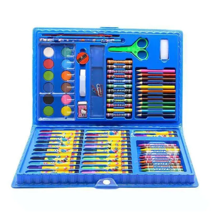 This 86pcs Kids Drawing and Color Art Set is perfect for young artists who love to create and explore their creativity. The set includes 24 watercolor pencils, 12 color crayons, 12 color wax sticks, 12 color pencils, 12 color pigments, 1 pencil sharpener, 1 eraser, 1 bottle of glue, 1 long lead, 1 sponge, 1 ruler, 1 safety scissors, 1 palette, 1 paint brush and 5 paperclips, all neatly organized in a case. With a wide range of colors and tools, this set is perfect for drawing, coloring, painting and more. Whether you're a beginner or an experienced artist, this set has everything you need to bring your imagination to life.